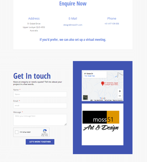 Here we see the contact page for Moss51 Art & Design. Using the proximity concept, important CTA elements are grouped, allowing visitors to scan the page and recognise actions they can take. We organise the space around each group to facilitate the reader’s comprehension of the content and structure it by the page’s CTA requirements.